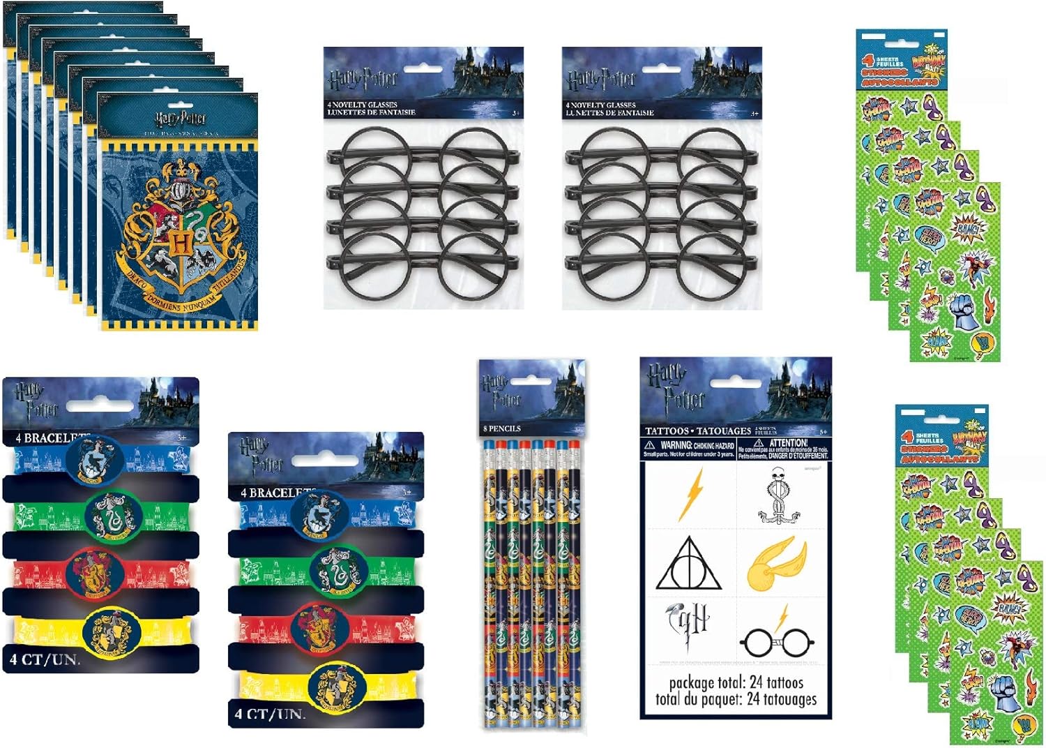 - Harry Potter Birthday Party Favor bundle includes: 8 Plastic Favor Loot Bags, 8 rubber bracelets, 8 glasses, 8 pencils, 24 tattoos (4 sheets), 8 Birthday Blast Sticker Sheets.