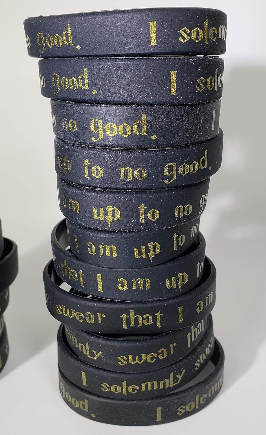 - Not your boring ole favors-- Unique unsex designs that will bring a smile to all girls and boys faces. 24 bands that have “I solemnly swear that I am up to no good” printed in gold letters in lighting font.
