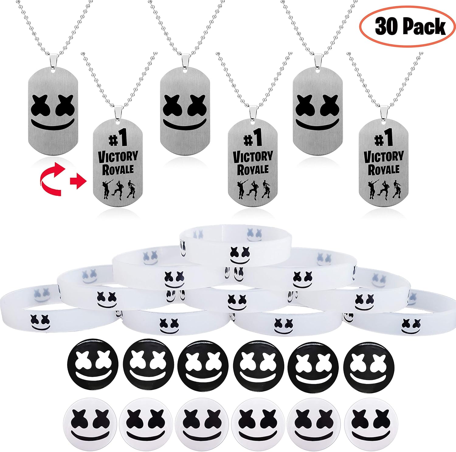 - THE ULTIMATE GIFT BUNDLE : 30 party favors set - serving up to 6 kids - 6 high quality stainless steel double sided necklaces, 12 premium quality glow in the dark silicone bracelets, 12 beautiful pin badges.